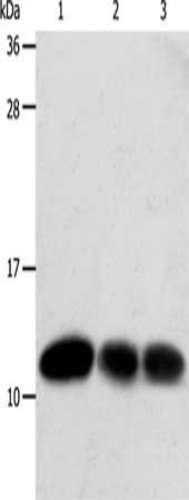 Gel: 12%SDS-PAGE, Lysate: 40 μg, Lane 1-3: Hela cells, MCF7 cells, human liver cancer tissue, Primary antibody: CSB-PA791069(TXN Antibody) at dilution 1/600, Secondary antibody: Goat anti rabbit IgG at 1/8000 dilution, Exposure time: 20 seconds