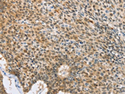 The image on the left is immunohistochemistry of paraffin-embedded Human thyroid cancer tissue using CSB-PA160666(UBQLN1 Antibody) at dilution 1/15, on the right is treated with fusion protein. (Original magnification: ×200)