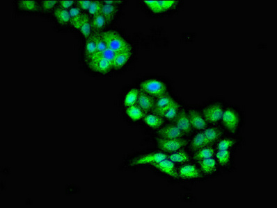 • Immunofluorescent analysis of PC-3 cells using CSB-PA025612LA01HU at dilution of 1:100 and Alexa Fluor 488-congugated AffiniPure Goat Anti-Rabbit IgG(H+L)