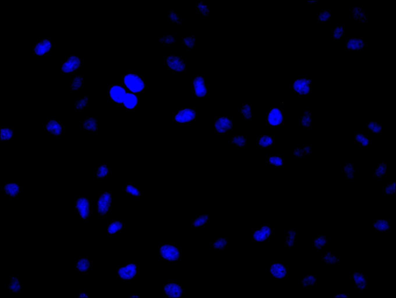 Immunofluorescence staining of Hela cell with 5% goat serum, counter-stained with DAPI. The cells were fixed in 4% formaldehyde and blocked in 10% normal Goat Serum. The cells were then incubated with the antibody overnight at 4C. The secondary antibody was Alexa Fluor 488-congugated AffiniPure Goat Anti-Rabbit IgG(H+L).