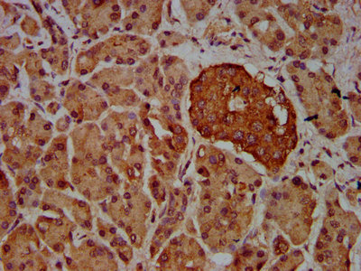 IHC image of CSB-PA768235LA01HU diluted at 1:600 and staining in paraffin-embedded human pancreatic tissue performed on a Leica BondTM system. After dewaxing and hydration, antigen retrieval was mediated by high pressure in a citrate buffer (pH 6.0). Section was blocked with 10% normal goat serum 30min at RT. Then primary antibody (1% BSA) was incubated at 4°C overnight. The primary is detected by a biotinylated secondary antibody and visualized using an HRP conjugated SP system.
