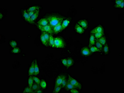 Immunofluorescence staining of HepG2 cells with CSB-PA896553LA01HU at 1:166, counter-stained with DAPI. The cells were fixed in 4% formaldehyde, permeabilized using 0.2% Triton X-100 and blocked in 10% normal Goat Serum. The cells were then incubated with the antibody overnight at 4°C. The secondary antibody was Alexa Fluor 488-congugated AffiniPure Goat Anti-Rabbit IgG(H+L).