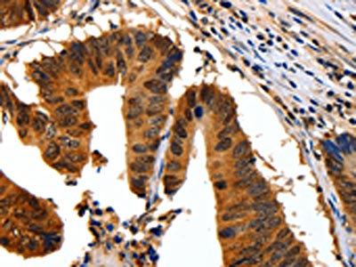 • The image on the left is immunohistochemistry of paraffin-embedded Human colon cancer tissue using CSB-PA179192(YWHAB Antibody) at dilution 1/30, on the right is treated with synthetic peptide. (Original magnification: ×200)