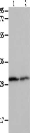 • Gel: 12%SDS-PAGE, Lysate: 30 μg, Lane 1-2: Hela cells, mouse kidney tissue, Primary antibody: CSB-PA179192(YWHAB Antibody) at dilution 1/550, Secondary antibody: Goat anti rabbit IgG at 1/8000 dilution, Exposure time: 10 seconds