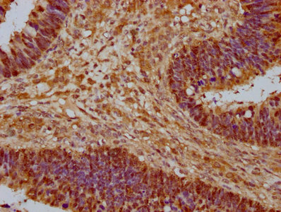 IHC image of CSB-PA01459A0Rb diluted at 1:1000 and staining in paraffin-embedded human ovarian cancer performed on a Leica BondTM system. After dewaxing and hydration, antigen retrieval was mediated by high pressure in a citrate buffer (pH 6.0). Section was blocked with 10% normal goat serum 30min at RT. Then primary antibody (1% BSA) was incubated at 4°C overnight. The primary is detected by a biotinylated secondary antibody and visualized using an HRP conjugated SP system.