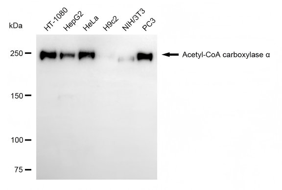 Western blotting analysis using acetyl-CoA carboxylase alpha antibody. Total cell lysates (30 μg) from various cell lines were loaded and separated by SDS-PAGE. The blot was incubated with acetyl-CoA carboxylase alpha antibody and HRP-conjugated goat anti-rabbit secondary antibody respectively.