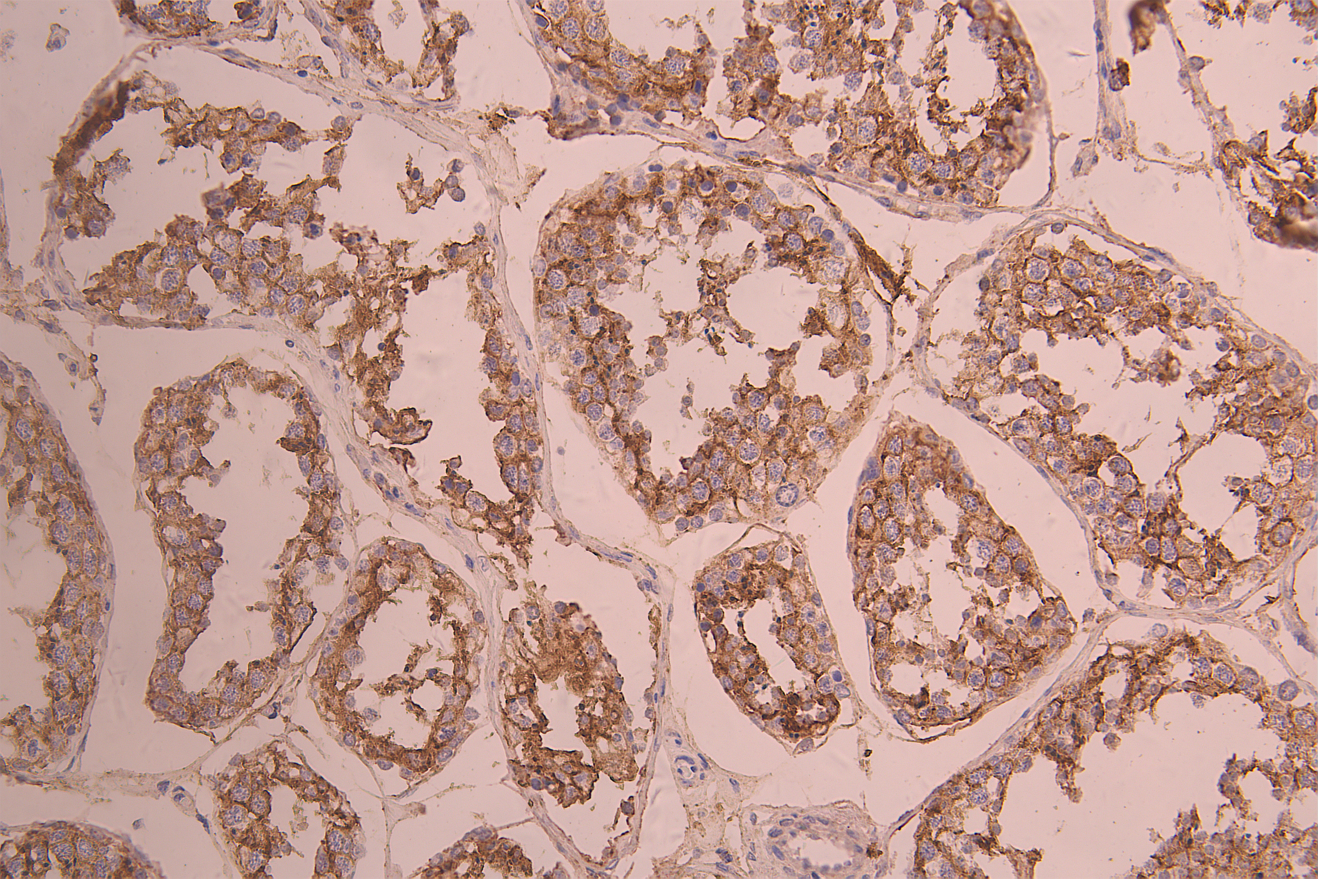 • IHC image of CSB-RA866317MA1HU diluted at 1:50 and staining in paraffin-embedded human testis tissue performed on a Leica BondTM system. After dewaxing and hydration, antigen retrieval was mediated by high pressure in a citrate buffer (pH 6.0). Section was blocked with 10% normal goat serum 30min at RT. Then primary antibody (1% BSA) was incubated at 4°C overnight. The primary is detected by a Anti-Human lgG, Fcy Fragment Specific labeled by HRP and visualized using 0.05% DAB.