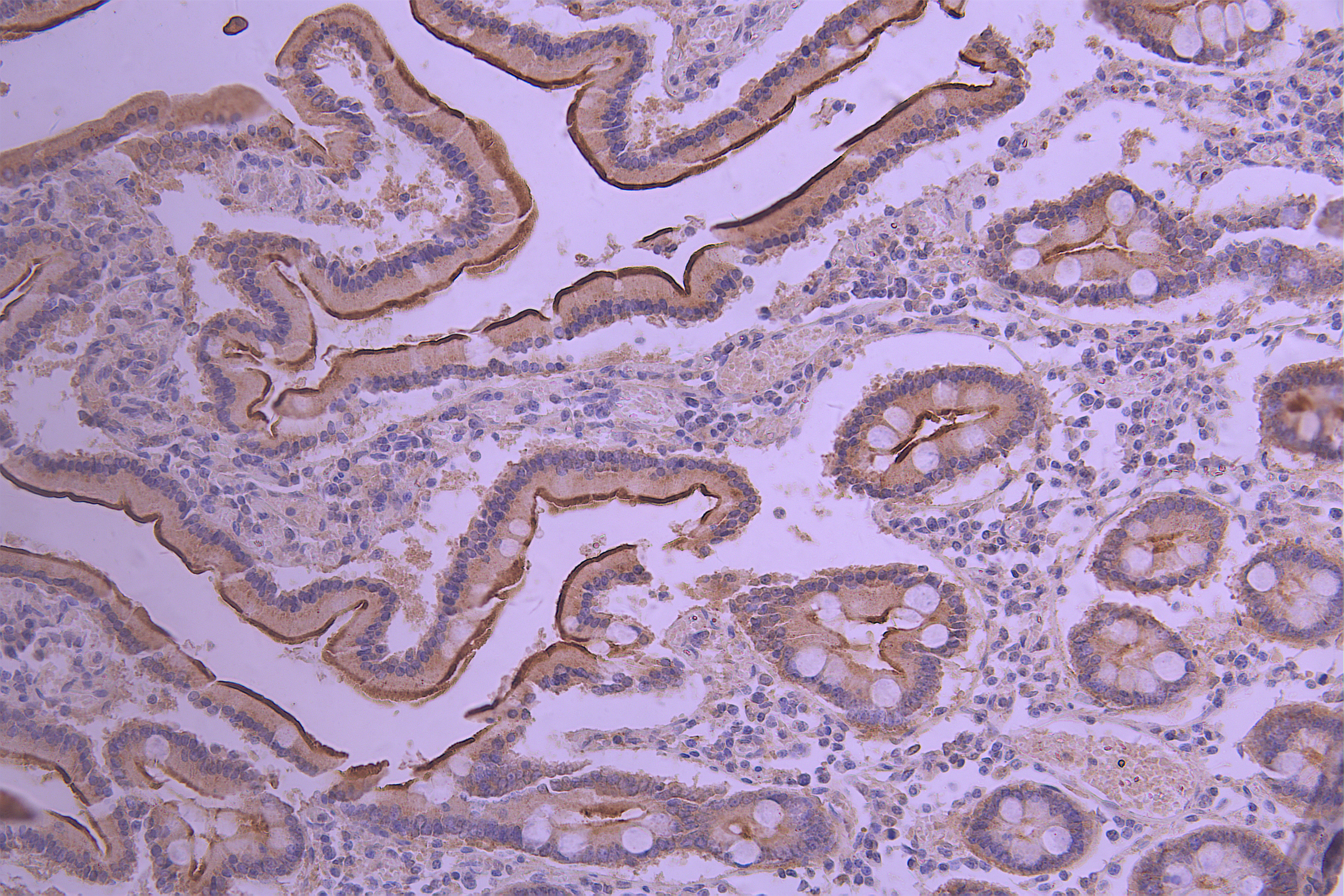 • IHC image of CSB-RA866317MA1HU diluted at 1:50 and staining in paraffin-embedded human small intestine tissue performed on a Leica BondTM system. After dewaxing and hydration, antigen retrieval was mediated by high pressure in a citrate buffer (pH 6.0). Section was blocked with 10% normal goat serum 30min at RT. Then primary antibody (1% BSA) was incubated at 4°C overnight. The primary is detected by a Anti-Human lgG, Fcy Fragment Specific labeled by HRP and visualized using 0.05% DAB.