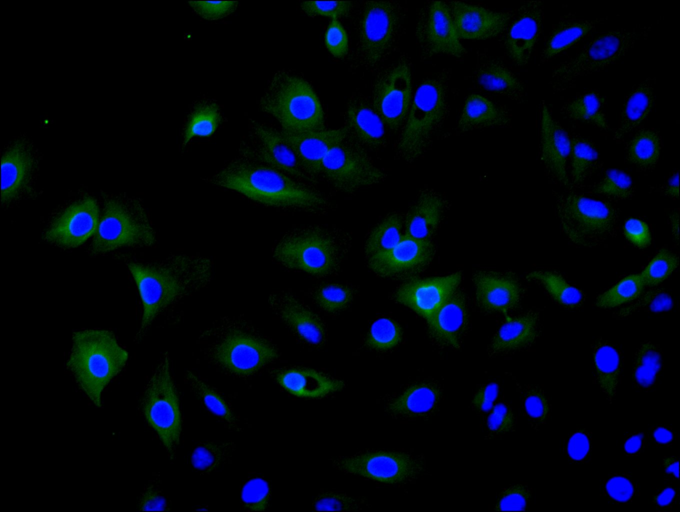 Immunofluorescence staining of A549 cell with CSB-RA624105MA1HU at 1:30 ,counter-stained with DAPI. The cells were fixed in 4% formaldehyde, permeabilized using 0.2% Triton X-100 and blocked in 10% normal Goat Serum. The cells were then incubated with the antibody overnight at 4°C. The secondary antibody was Fluorescein (FITC) AffiniPure Goat Anti-Human IgG, Fcγ fragment specific.