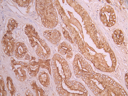 • IHC image of CSB-RA255091A0HU diluted at 1:100 and staining in paraffin-embedded human prostate cancer performed on a Leica BondTM system. After dewaxing and hydration, antigen retrieval was mediated by high pressure in a citrate buffer (pH 6.0). Section was blocked with 10% normal goat serum 30min at RT. Then primary antibody (1% BSA) was incubated at 4°C overnight. The primary is detected by a Goat anti-rabbit polymer IgG labeled by HRP and visualized using 0.05% DAB.