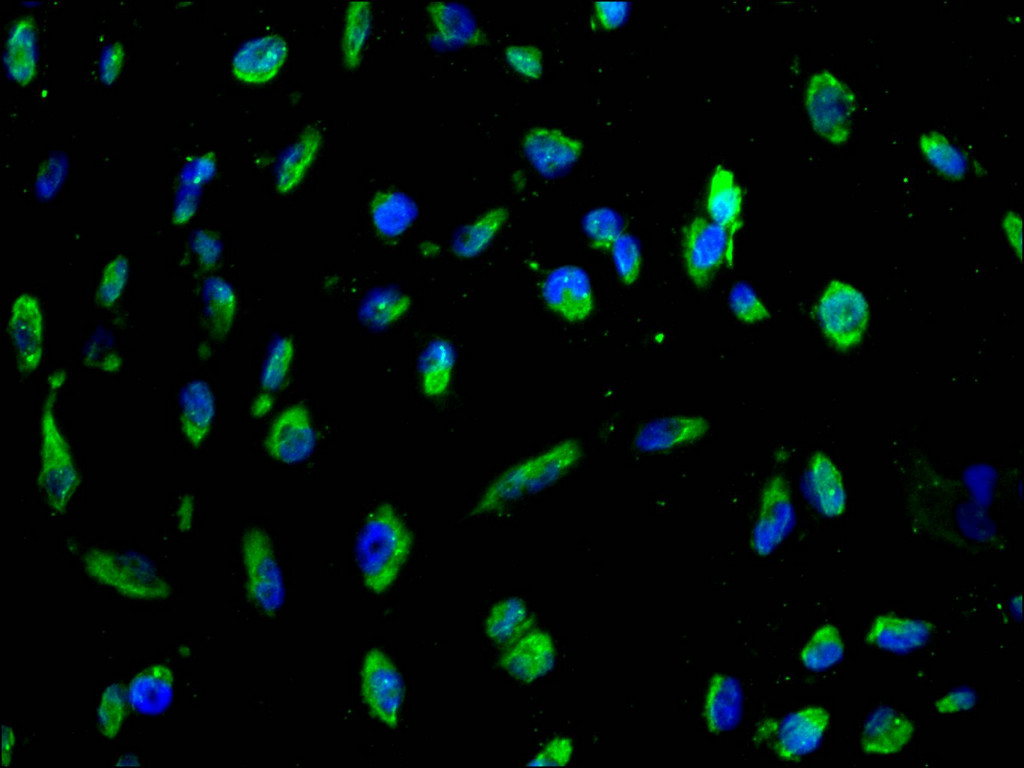 Immunofluorescence staining of MCF-7 cell with CSB-RA562580A0HU at 1:50, counter-stained with DAPI. The cells were fixed in 4% formaldehyde and blocked in 10% normal Goat Serum. The cells were then incubated with the antibody overnight at 4°C. The secondary antibody was Alexa Fluor 488-congugated AffiniPure Goat Anti-Rabbit IgG(H+L).