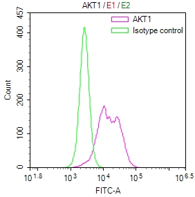 • Overlay Peak curve showing PC-3 cells stained with CSB-RA001553MA1HU (red line) at 1:100. The cells were fixed in 4% formaldehyde and permeated by 0.2% TritonX-100 for 10min. Then 10% normal goat serum to block non-specific protein-protein interactions followed by the antibody (1ug/1*106cells) for 45min at 4℃. The secondary antibody used was Fluorescein (FITC) AffiniPure Goat Anti-Human IgG, Fcγ fragment specific at 1:200 dilution for 35min at 4℃.Control antibody (green line) was human IgG1 (1ug/1*106cells) used under the same conditions. Acquisition of >10,000 events was performed.
