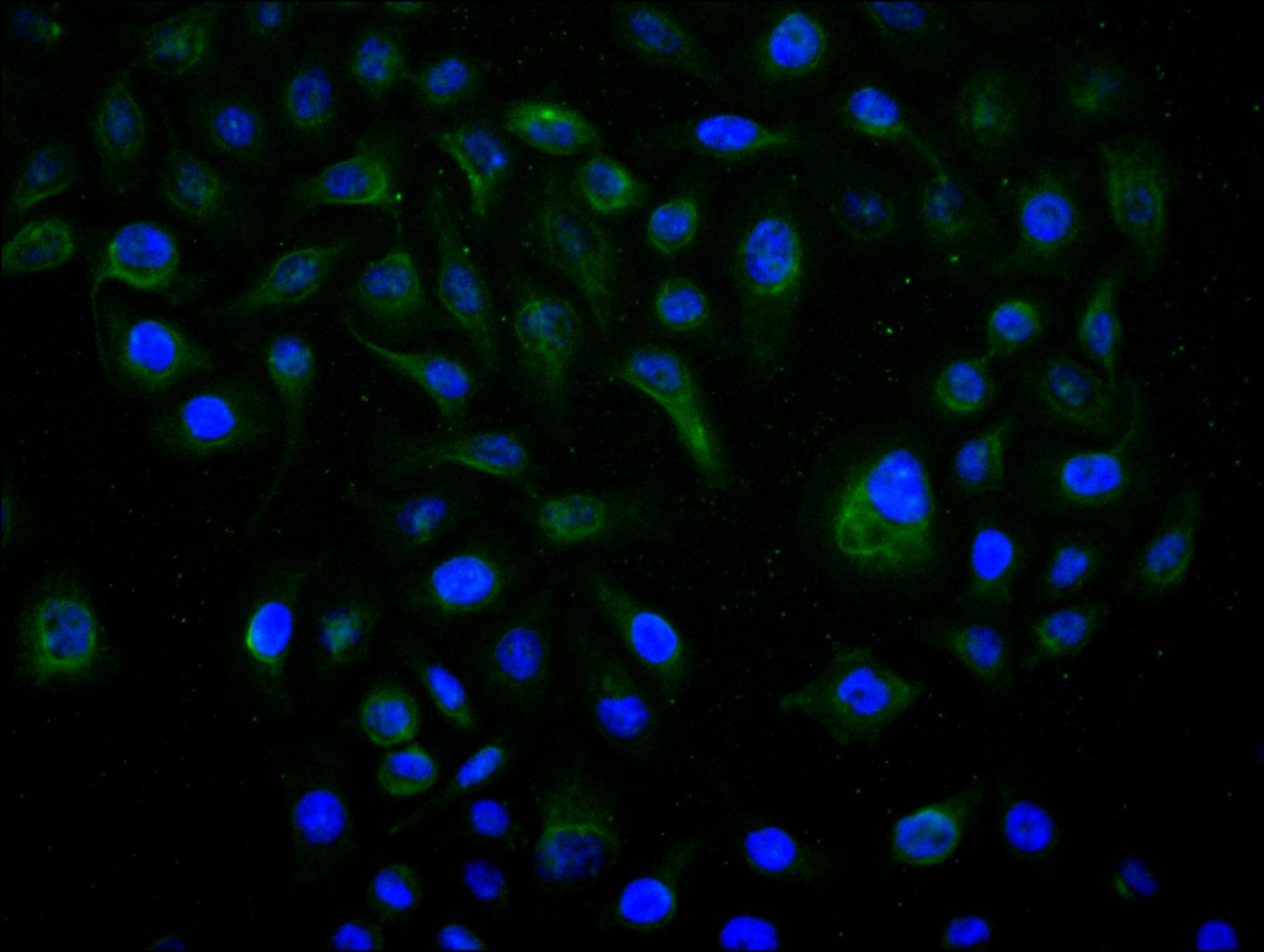 • Immunofluorescence staining of A549 cell with CSB-RA001553MA1HU at 1:30 ,counter-stained with DAPI. The cells were fixed in 4% formaldehyde, permeabilized using 0.2% Triton X-100 and blocked in 10% normal Goat Serum. The cells were then incubated with the antibody overnight at 4°C. The secondary antibody was Fluorescein (FITC) AffiniPure Goat Anti-Human IgG, Fcγ fragment specific.