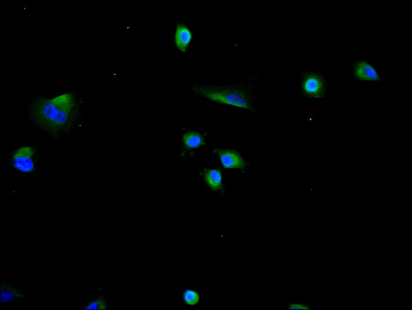• Immunofluorescence staining of Hela cell with CSB-RA001553MA1HU at 1:30 ,counter-stained with DAPI. The cells were fixed in 4% formaldehyde, permeabilized using 0.2% Triton X-100 and blocked in 10% normal Goat Serum. The cells were then incubated with the antibody overnight at 4°C. The secondary antibody was Fluorescein (FITC) AffiniPure Goat Anti-Human IgG, Fcγ fragment specific.