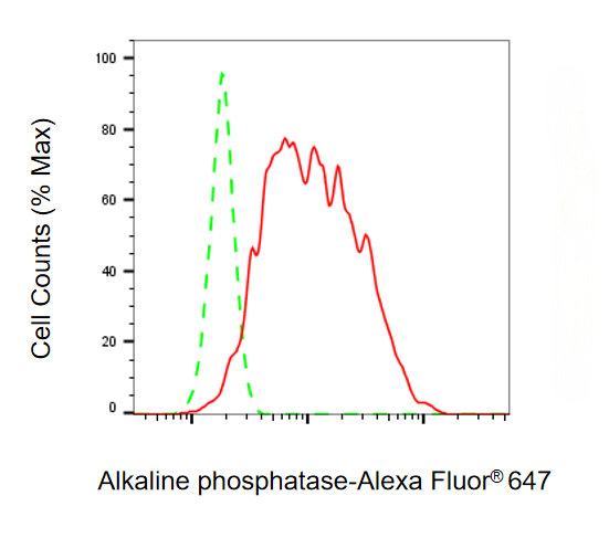 • Flow cytometric analysis of Alkaline phosphatase expression in HepG2 cells using Alkaline phosphatase antibody. Green, isotype control; red, Alkaline phosphatase.