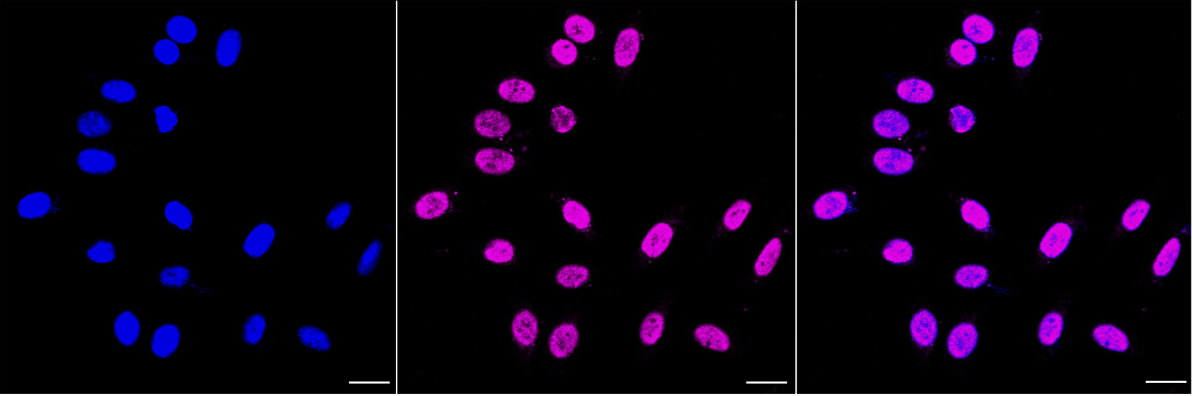 • Immunocytochemical staining of HepG2 cells with Alkaline phosphatase antibody. Nuclei were stained blue with DAPI; Alkaline phosphatase was stained magenta with Alexa Fluor? 647. Images were taken using Leica stellaris 5. Protein abundance based on laser Intensity and smart gain: Medium. Scale bar, 20 μm.