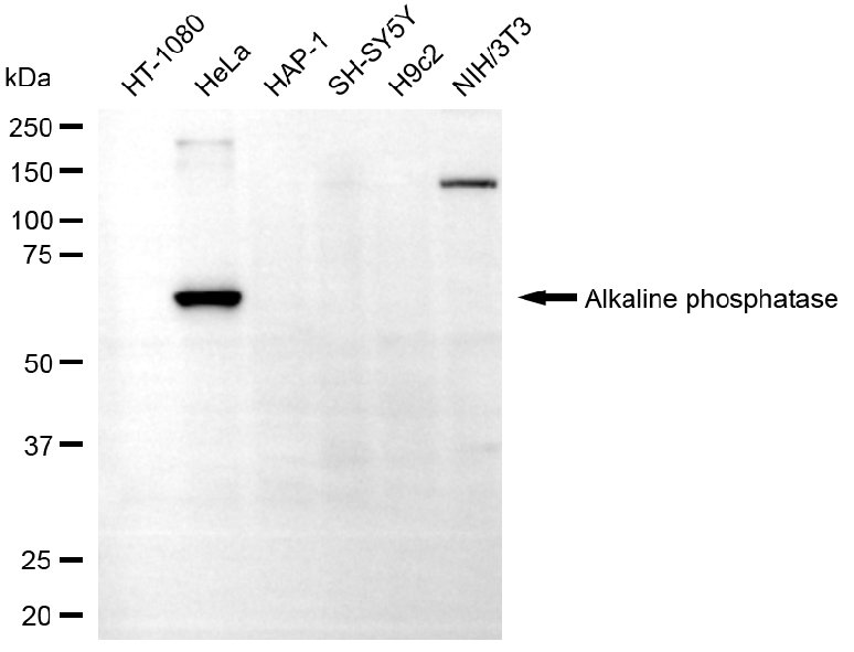 • Western blotting analysis using alkaline phosphatase antibody. Total cell lysates (30 μg) from various cell lines were loaded and separated by SDS-PAGE. The blot was incubated with alkaline phosphatase antibody and HRP-conjugated goat anti-rabbit secondary antibody respectively.