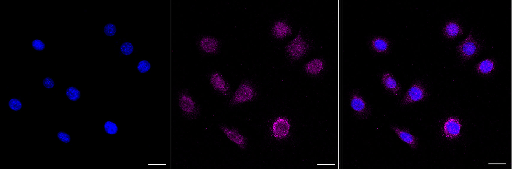 • Immunocytochemical staining of C2C12 cells with Annexin A6 antibody. Nuclei were stained blue with DAPI; Annexin A6 was stained magenta with Alexa Fluor? 647. Images were taken using Leica stellaris 5. Protein abundance based on laser Intensity and smart gain: Medium. Scale bar, 20 μm.