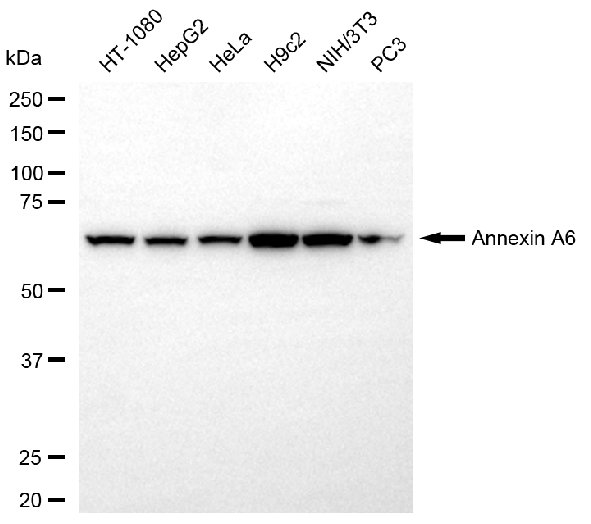 • Western blotting analysis using annexin A6 antibody. Total cell lysates (20 μg) from various cell lines were loaded and separated by SDS-PAGE. The blot was incubated with annexin A6 antibody and HRP-conjugated goat anti-rabbit secondary antibody respectively.