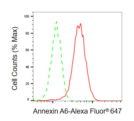 Flow cytometric analysis of Annexin A6 expression in HepG2 cells using Annexin A6 antibody. Green, isotype control; red, Annexin A6.