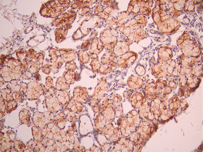 IHC image of CSB-RA192672A0HU diluted at 1:100 and staining in paraffin-embedded human salivary gland tissue performed on a Leica BondTM system. After dewaxing and hydration, antigen retrieval was mediated by high pressure in a citrate buffer (pH 6.0). Section was blocked with 10% normal goat serum 30min at RT. Then primary antibody (1% BSA) was incubated at 4°C overnight. The primary is detected by a Goat anti-rabbit polymer IgG labeled by HRP and visualized using 0.05% DAB.