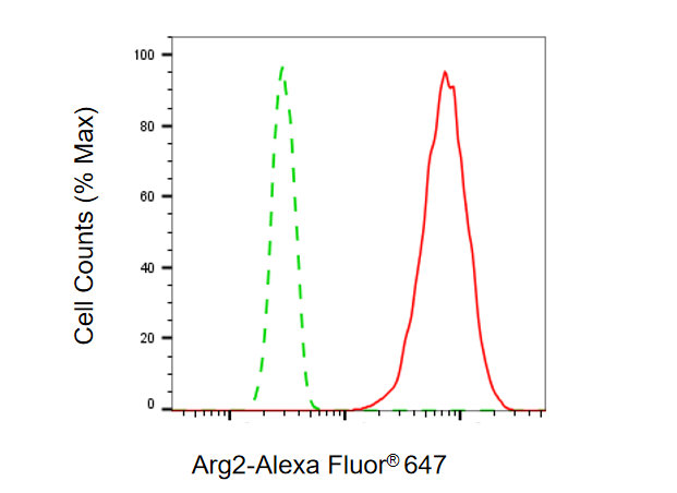 Flow cytometric analysis of Arg2 expression in HT-1080 cells using Arg2 antibody. Green, isotype control; red, Arg2.