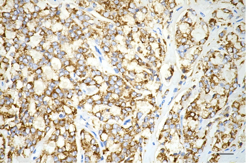 Immunohistochemistry was performed on paraffin-embedded human prostatic adenocarcinoma using arg2 antibody. Antigen retrieval was done in sodium citrate buffer (pH 6.0). DAB was used for detection, with hematoxylin counterstaining. Images were acquired using a Nikon Ci-L Plus microscope (40× objective). Scale bar: 25 μm.