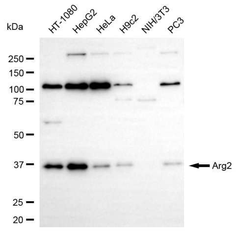 Western blotting analysis using arg2 antibody. Total cell lysates (30 μg) from various cell lines were loaded and separated by SDS-PAGE. The blot was incubated with arg2 antibody and HRP-conjugated goat anti-rabbit secondary antibody respectively.