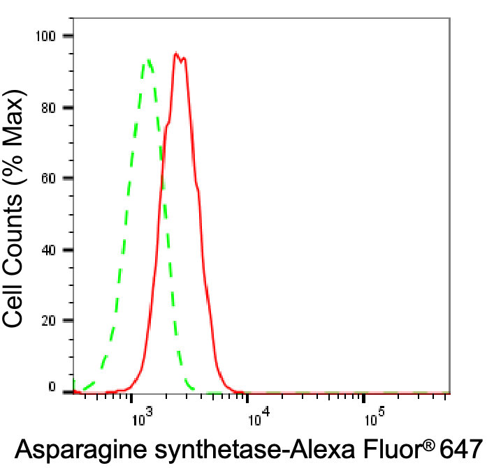• Flow cytometric analysis of Asparagine synthetase expression in HAP-1 cells using Asparagine synthetase antibody. Green, isotype control; red, Asparagine synthetase.