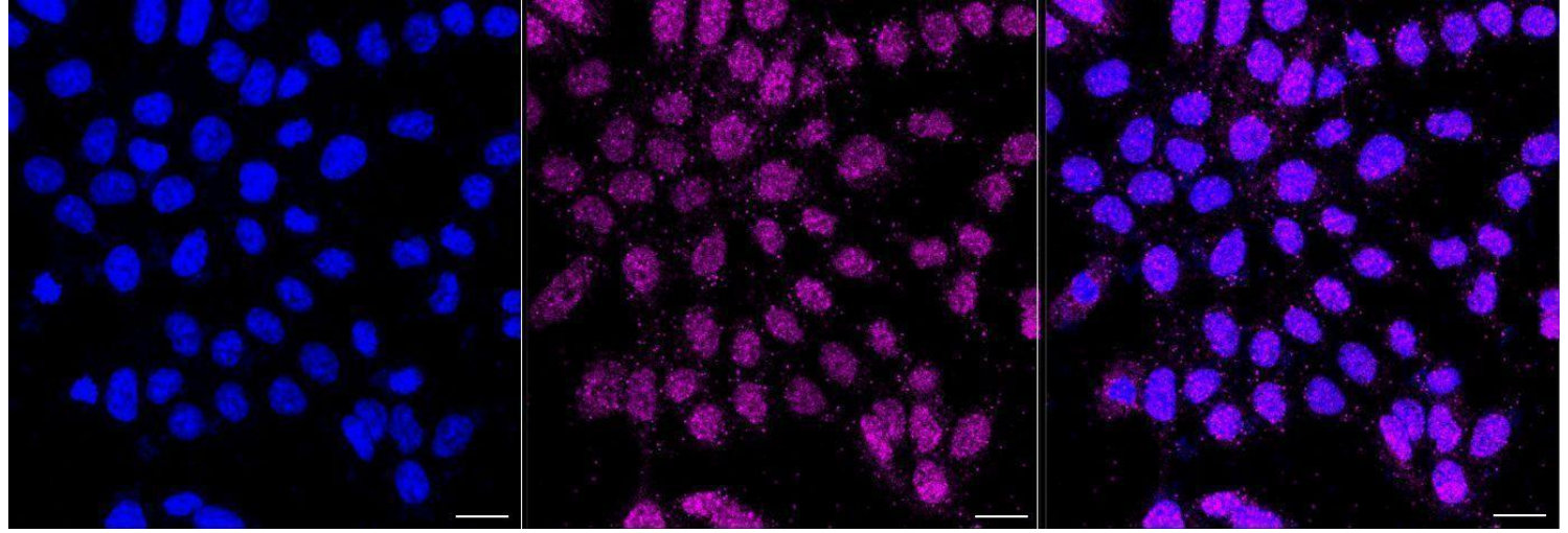 • Immunocytochemical staining of HAP-1 cells with Asparagine synthetase antibody. Nuclei were stained blue with DAPI; Asparagine synthetase was stained magenta with Alexa Fluor? 647. Images were taken using Leica stellaris 5. Protein abundance based on laser Intensity and smart gain: Medium. Scale bar, 20 μm.