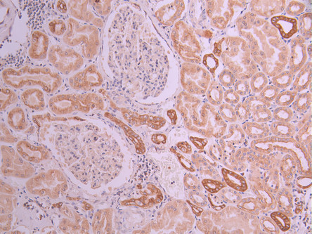 • IHC image of CSB-RA050869A0HU diluted at 1:100 and staining in paraffin-embedded human kidney tissue performed on a Leica BondTM system. After dewaxing and hydration, antigen retrieval was mediated by high pressure in a citrate buffer (pH 6.0). Section was blocked with 10% normal goat serum 30min at RT. Then primary antibody (1% BSA) was incubated at 4°C overnight. The primary is detected by a Goat anti-rabbit polymer IgG labeled by HRP and visualized using 0.05% DAB.
