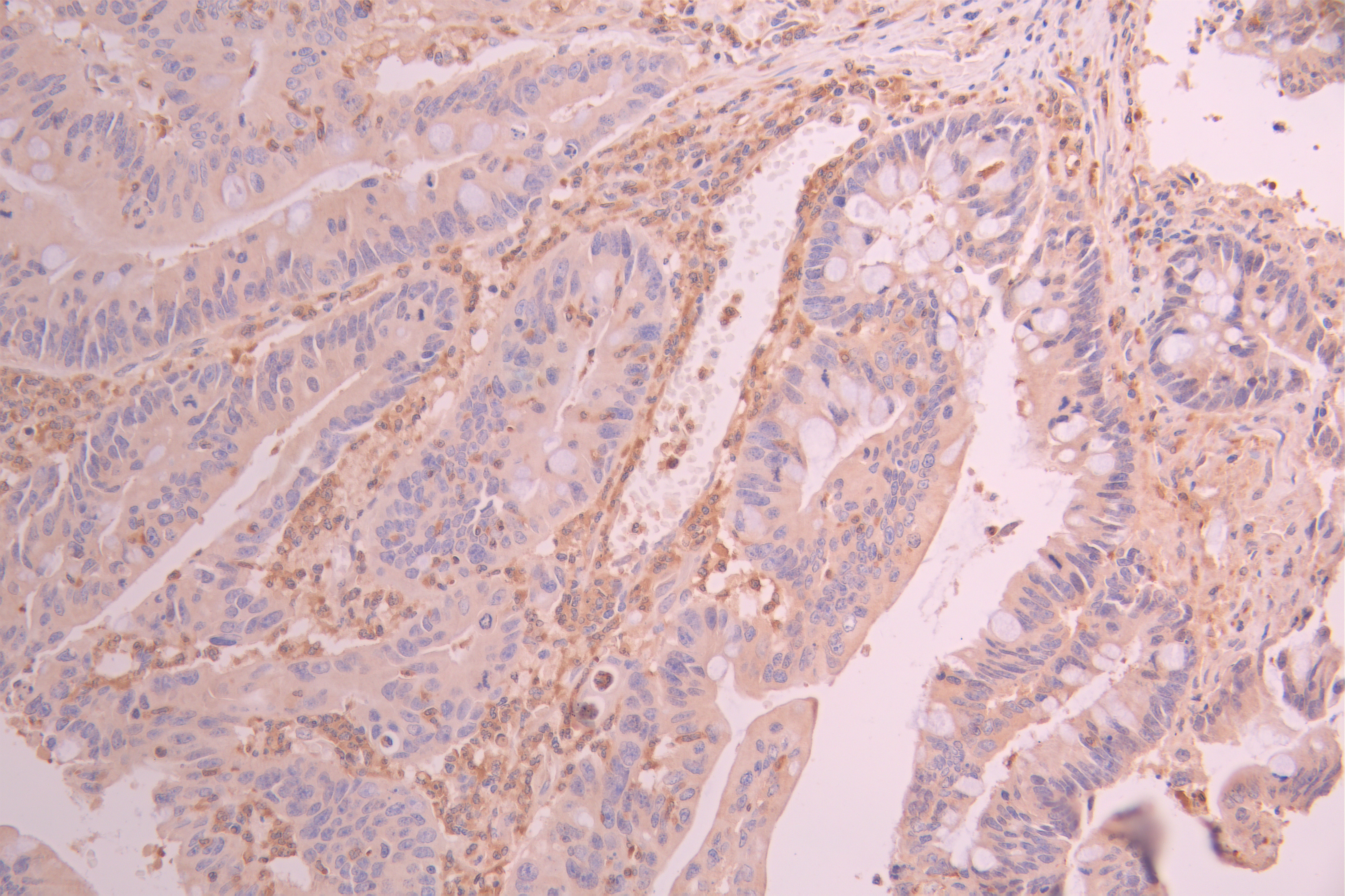 IHC image of CSB-RA554727A0HU diluted at 1:100 and staining in paraffin-embedded human colorectal cancer performed on a Leica BondTM system. After dewaxing and hydration, antigen retrieval was mediated by high pressure in a citrate buffer (pH 6.0). Section was blocked with 10% normal goat serum 30min at RT. Then primary antibody (1% BSA) was incubated at 4°C overnight. The primary is detected by a Goat anti-rabbit polymer IgG labeled by HRP and visualized using 0.05% DAB.