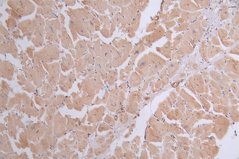 IHC image of CSB-RA076873A0HU diluted at 1:50 and staining in paraffin-embedded human heart tissue performed on a Leica BondTM system. After dewaxing and hydration, antigen retrieval was mediated by high pressure in a citrate buffer (pH 6.0). Section was blocked with 10% normal goat serum 30min at RT. Then primary antibody (1% BSA) was incubated at 4°C overnight. The primary is detected by a Goat anti-rabbit polymer IgG labeled by HRP and visualized using 0.41% DAB.