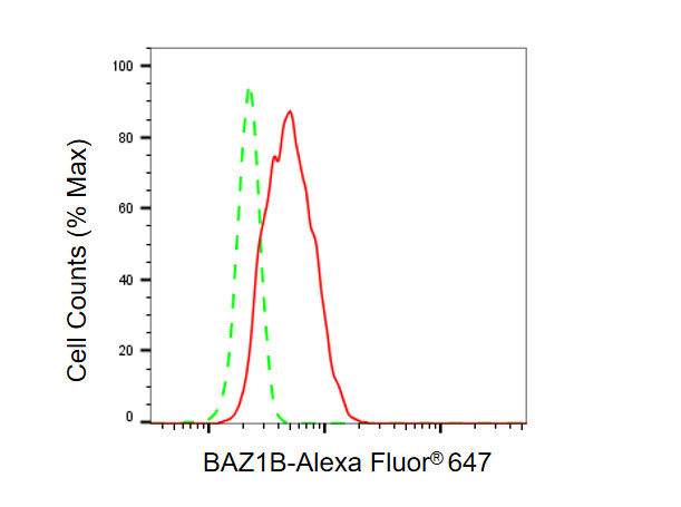 Flow cytometric analysis of BAZ1B expression in HeLa cells using BAZ1B antibody. Green, isotype control; red, BAZ1B.
