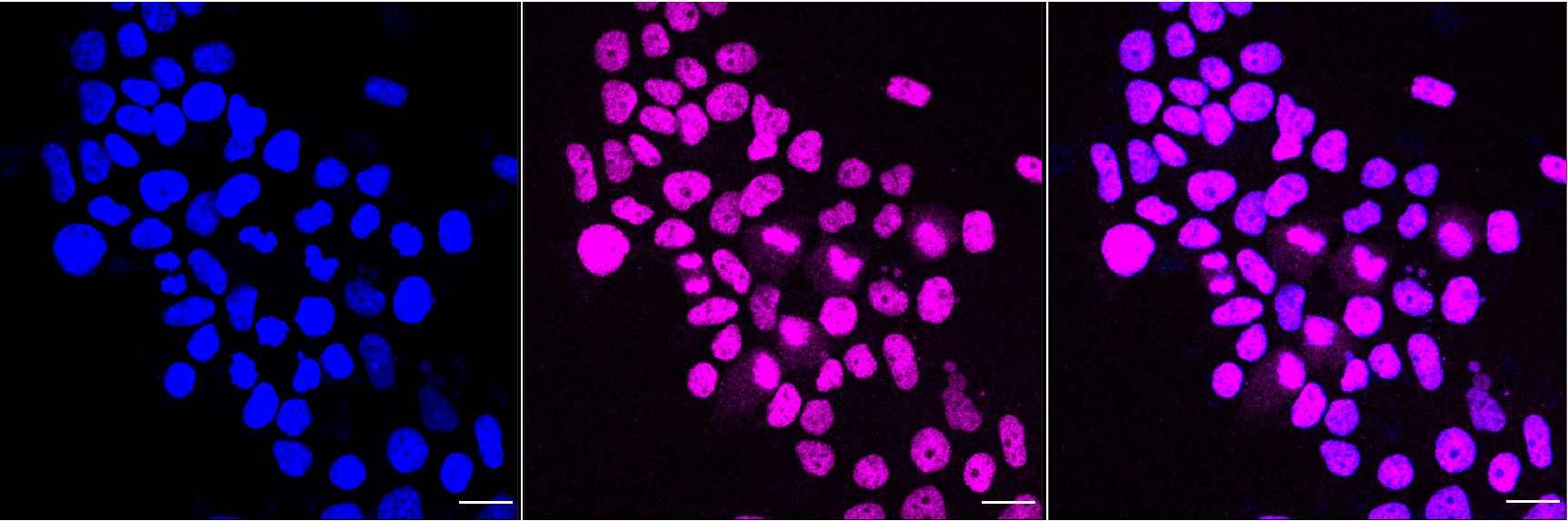 Immunocytochemical staining of Hela cells with BAZ1B antibody. Nuclei were stained blue with DAPI; BAZ1B was stained magenta with Alexa Fluor? 647. Images were taken using Leica stellaris 5. Protein abundance based on laser Intensity and smart gain: Medium. Scale bar, 20 μm.