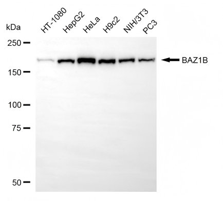 Western blotting analysis using BAZ1B antibody. Total cell lysates (30 μg) from various cell lines were loaded and separated by SDS-PAGE. The blot was incubated with BAZ1B antibody and HRP-conjugated goat anti-rabbit secondary antibody respectively.