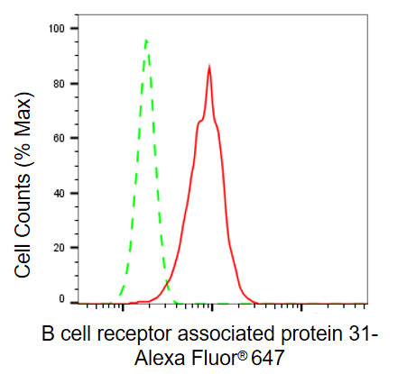 • Flow cytometric analysis of B cell receptor associated protein 31 expression in HepG2 cells using B cell receptor associated protein 31 antibody. Green, isotype control; red, B cell receptor associated protein 31.