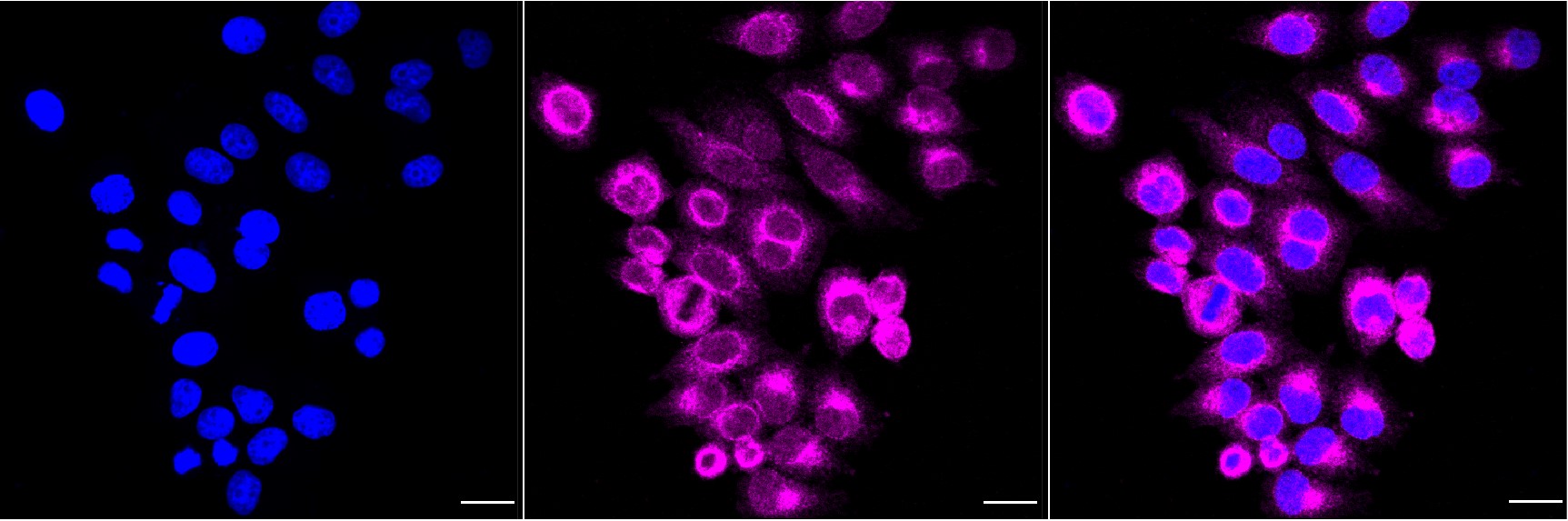 • Immunocytochemical staining of HepG2 cells with B cell receptor associated protein 31 antibody. Nuclei were stained blue with DAPI; B cell receptor associated protein 31 was stained magenta with Alexa Fluor? 647. Images were taken using Leica stellaris 5. Protein abundance based on laser Intensity and smart gain: Medium. Scale bar, 20 μm.