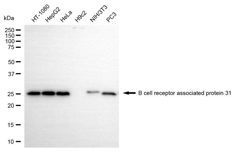 • Western blotting analysis using B cell receptor associated protein 31 antibody. Total cell lysates (30 μg) from various cell lines were loaded and separated by SDS-PAGE. The blot was incubated with B cell receptor associated protein 31 antibody and HRP-conjugated goat anti-rabbit secondary antibody respectively.