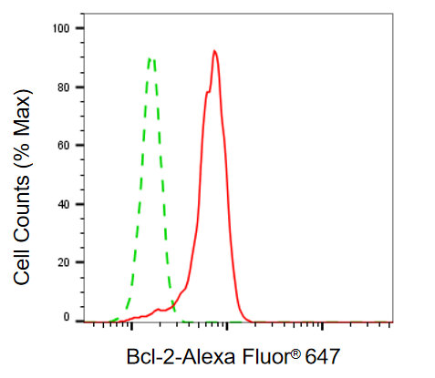 • Flow cytometric analysis of Bcl-2 expression in HepG2 cells using Bcl-2 antibody. Green, isotype control; red, Bcl-2.