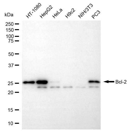 • Western blotting analysis using bcl-2 antibody. Total cell lysates (30 μg) from various cell lines were loaded and separated by SDS-PAGE. The blot was incubated with bcl-2 antibody and HRP-conjugated goat anti-rabbit secondary antibody respectively.