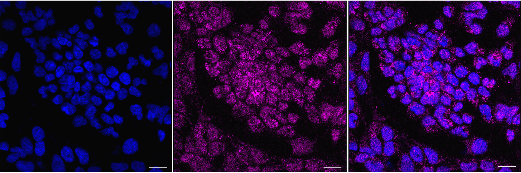 • Immunocytochemical staining of HeLa cells with Complement C3 antibody. Nuclei were stained blue with DAPI; Complement C3 was stained magenta with Alexa Fluor? 647. Images were taken using Leica stellaris 5. Protein abundance based on laser Intensity and smart gain: Medium. Scale bar, 20 μm.