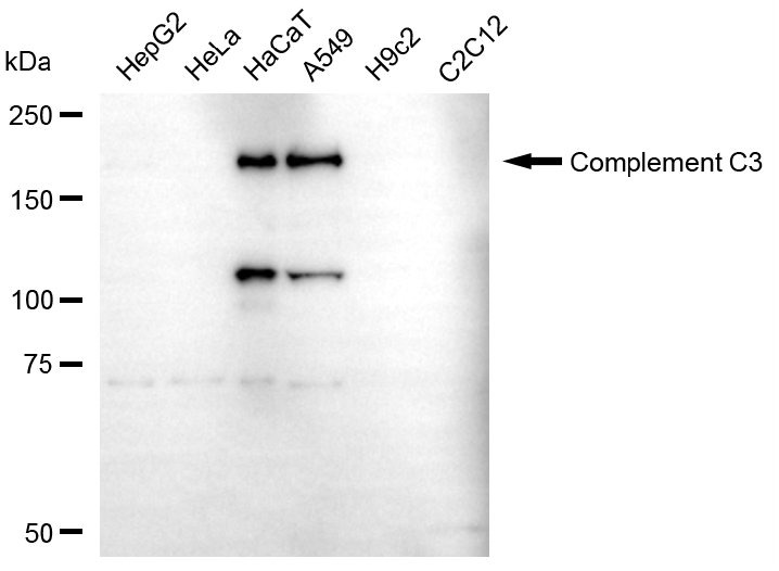 • Western blotting analysis using complement C3 antibody. Total cell lysates (30 μg) from various cell lines were loaded and separated by SDS-PAGE. The blot was incubated with complement C3 antibody and HRP-conjugated goat anti-rabbit secondary antibody respectively.