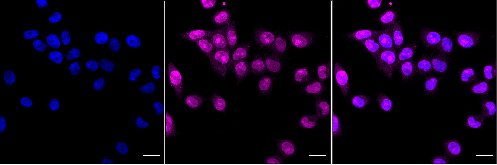 Immunocytochemical staining of HepG2 cells with Carbonic anhydrase 9 antibody. Nuclei were stained blue with DAPI; Carbonic anhydrase 9 was stained magenta with Alexa Fluor? 647. Images were taken using Leica stellaris 5. Protein abundance based on laser Intensity and smart gain: High. Scale bar, 20 μm.