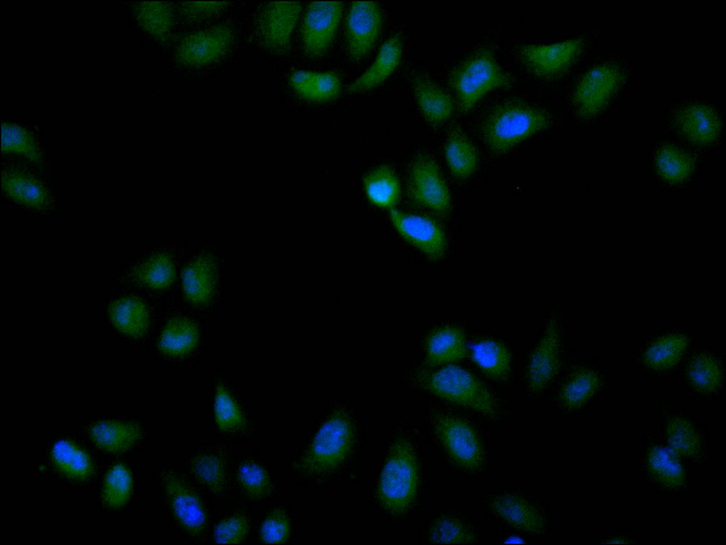 Immunofluorescence staining of Hela cell with CSB-RA593154A0HU at 1:50, counter-stained with DAPI. The cells were fixed in 4% formaldehyde, permeabilized using 0.2% Triton X-100 and blocked in 10% normal Goat Serum. The cells were then incubated with the antibody overnight at 4°C. The secondary antibody was Alexa Fluor 488-congugated AffiniPure Goat Anti-Rabbit IgG(H+L).