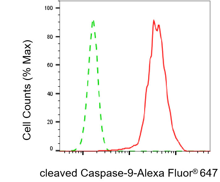 • Flow cytometric analysis of cleaved Caspase-9 expression in HepG2 cells using cleaved Caspase-9 antibody. Green, isotype control; red, cleaved Caspase-9.