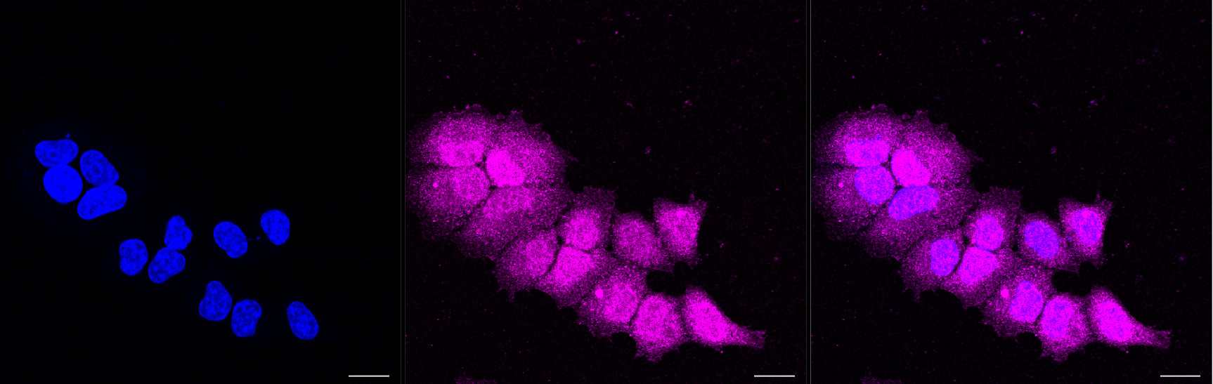 • Immunocytochemical staining of HepG2 cells with cleaved Caspase-9 antibody. Nuclei were stained blue with DAPI; cleaved Caspase-9 was stained magenta with Alexa Fluor? 647. Images were taken using Leica stellaris 5. Protein abundance based on laser Intensity and smart gain: Medium. Scale bar, 20 μm.