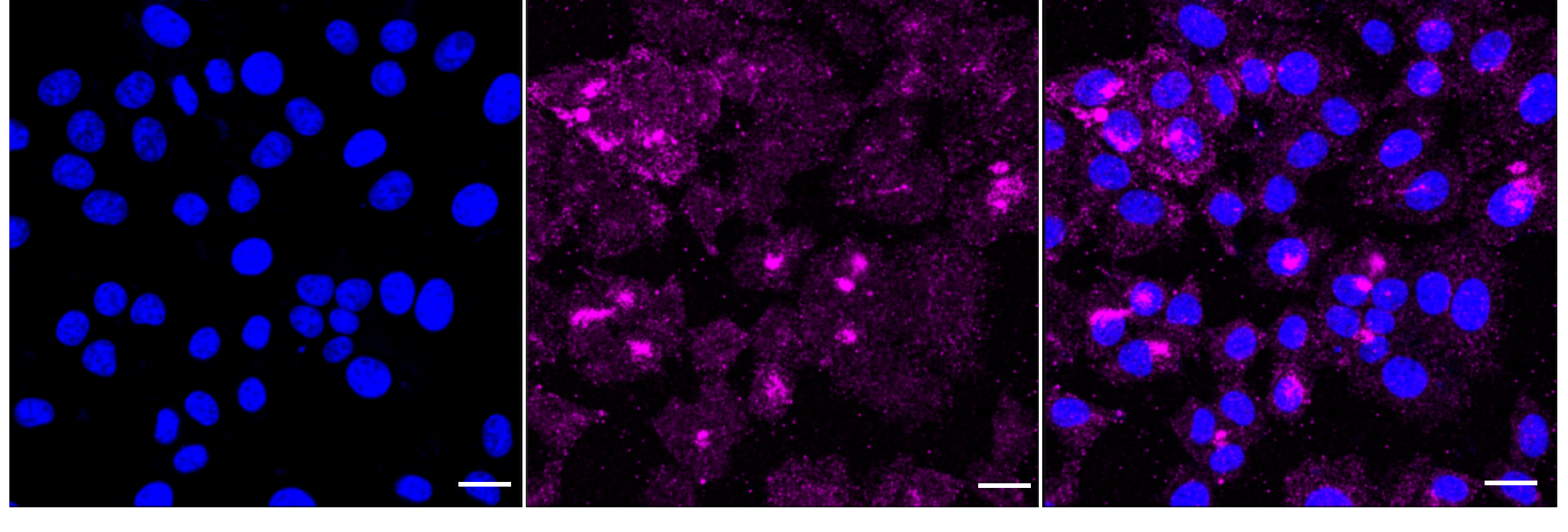 • Immunocytochemical staining of HepG2 cells with Caveolin 1 antibody. Nuclei were stained blue with DAPI; Caveolin 1 was stained magenta with Alexa Fluor? 647. Images were taken using Leica stellaris 5. Protein abundance based on laser Intensity and smart gain: Medium. Scale bar: 20 μm.