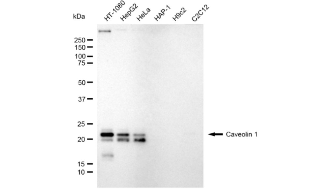 • Western blotting analysis using Caveolin 1 antibody. Total cell lysates (5 μg) from various cell lines were loaded and separated by SDS-PAGE. The blot was incubated with Caveolin 1 antibody and HRP-conjugated goat anti-rabbit secondary antibody respectively.
