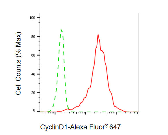 • Flow cytometric analysis of Cyclin D1 expression in C2C12 cells using Cyclin D1 antibody. Green, isotype control; red, Cyclin D1.